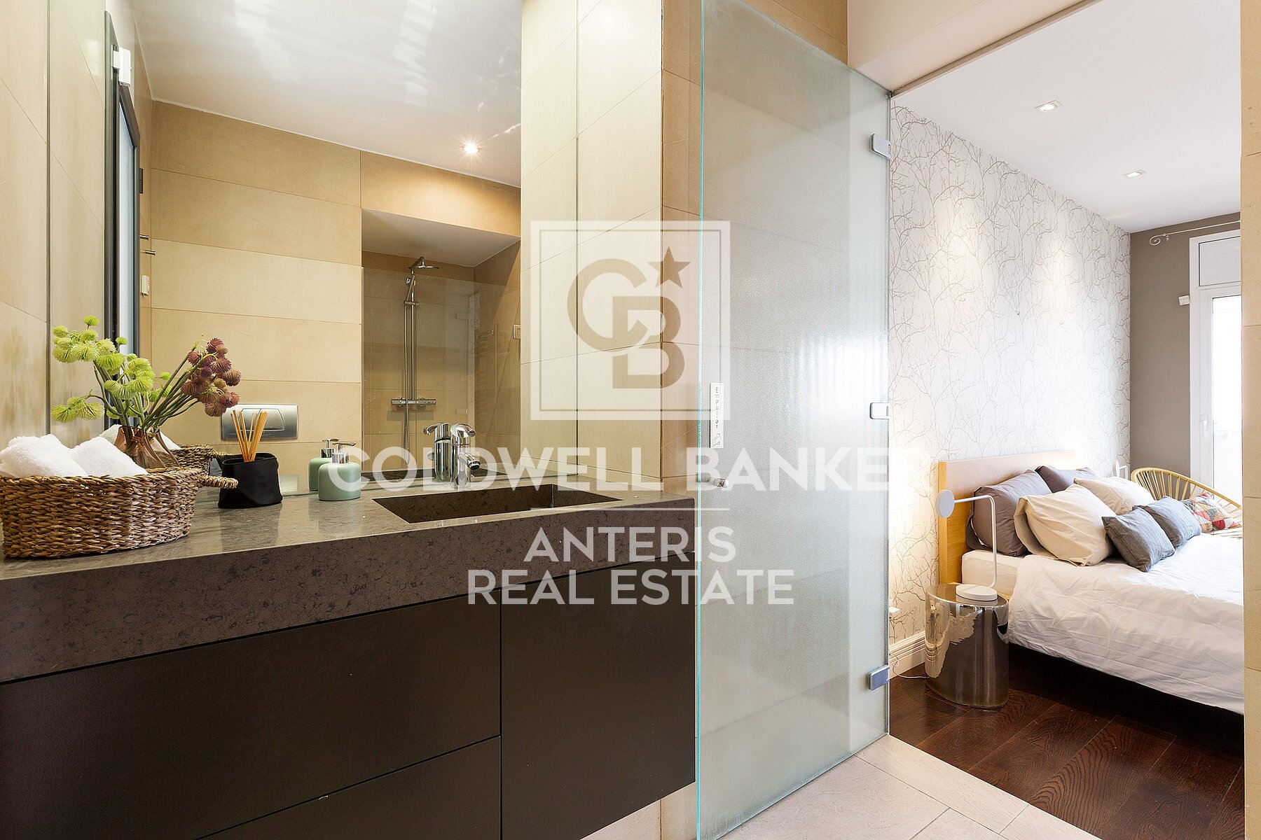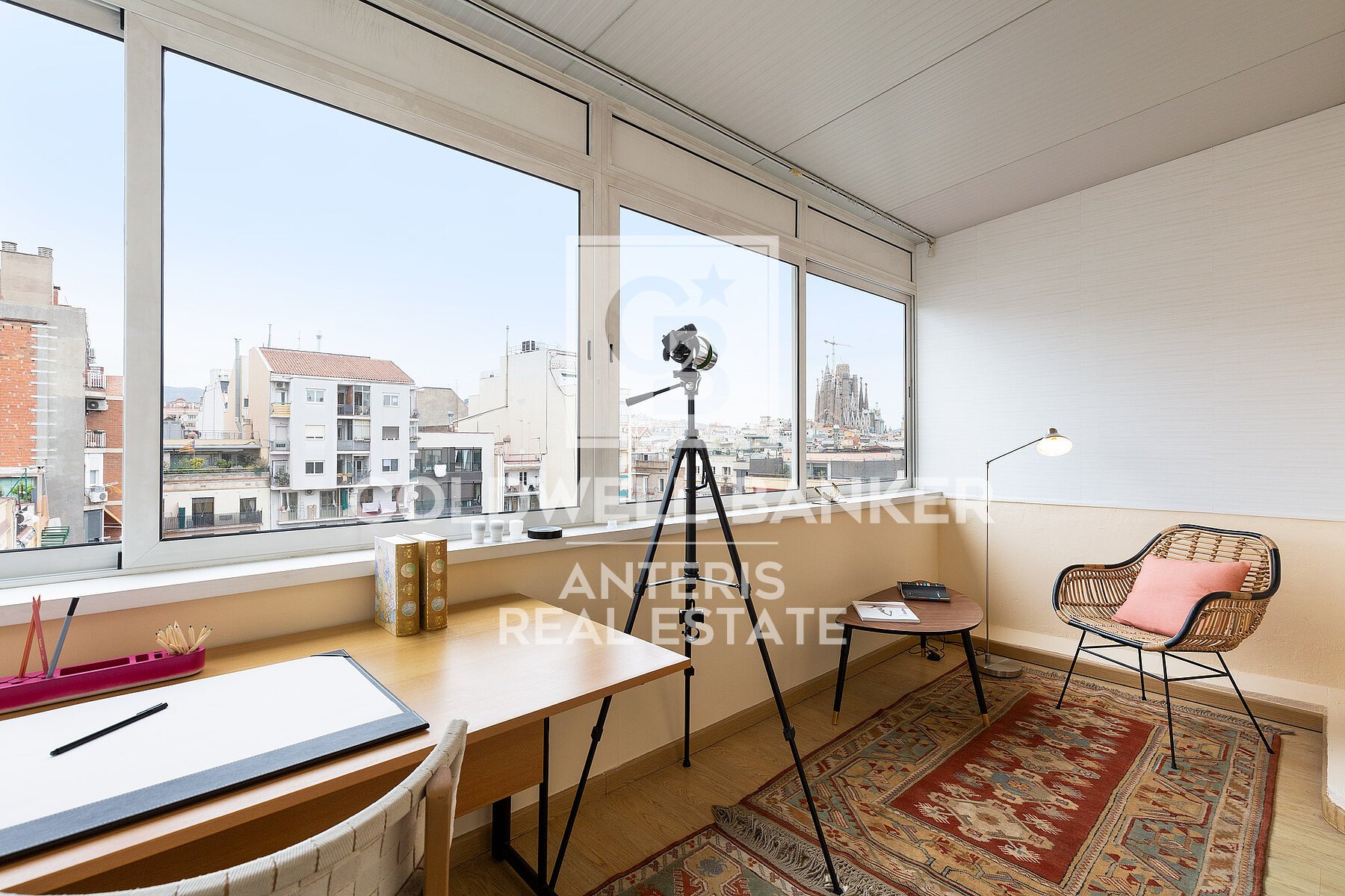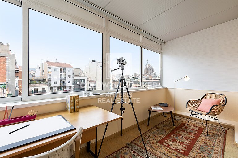 A pocos pasos del Passeig Sant Joan y a menos de 10 minutos andando del Passeig de Gracia, encontramos este magnífico ático con dos terrazas. Ubicado en un edificio señorial reformado hace unos años, la propiedad ofrece todo lo que esperarías de un ático en el Eixample. Sol, tranquilidad y una ubicación privilegiada a tan solo unos minutos del Paseo de Gracias, Paseo San Juan, el Arco del Triunfo, el Parque de la Ciutadella o la Sagrada Familia. Encontramos el espacio abierto de la cocina y el salón con mucha luz natural y comunicado con la soleada terraza orientada al mar a través de grandes puertas/ventanas correderas, que se convierten en una extensión del salón al quedar completamente ocultas las puertas correderas. Igualmente espectacular es la amplia zona de dormitorio principal con baño ensuite, y otra terraza con vistas a la Sagrada Familia. Este patio cerrado con carpintería de aluminio se convierte en una zona de trabajo o descanso que se puede disfrutar todo el año.